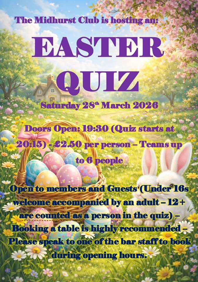 Easter Quiz – Midhurst Club Sat, Mar 28 7:30 pm midhurst club, Midhurst, West sussex, GU29 9DR Add to calendar Google Calendar iCalendar Outlook 365 Outlook Live