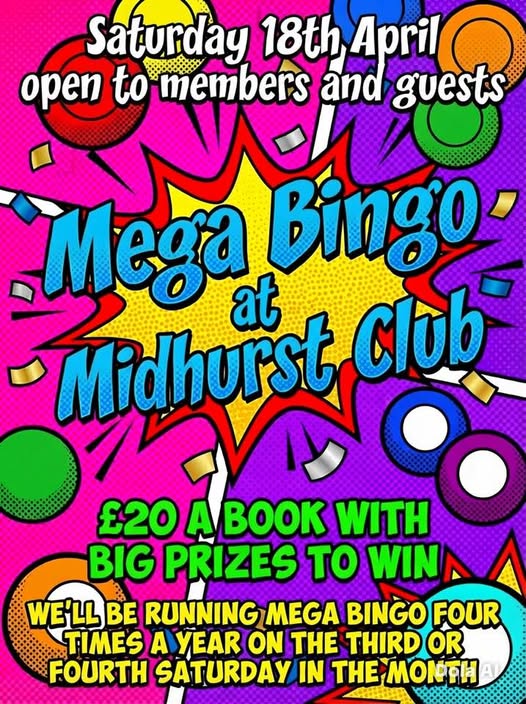 Sat 4 April at 7:30 pm – 11:00 pm Bingo Night @ Midhurst Club Bingo Night @ Midhurst Club midhurst club, 47a North Street, Midhurst