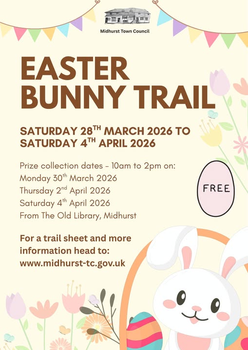 Town Centre, MidhurstOur FREE Easter Trail goes live on 28th March. We have over 100 Easter eggs to give away. Come and collect your prize on the dates listed below on the poster. Collect a trail sheet from outside The Old Library or download from our website https://midhurst-tc.gov.uk/half-term-activities-2/ Happy hunting.